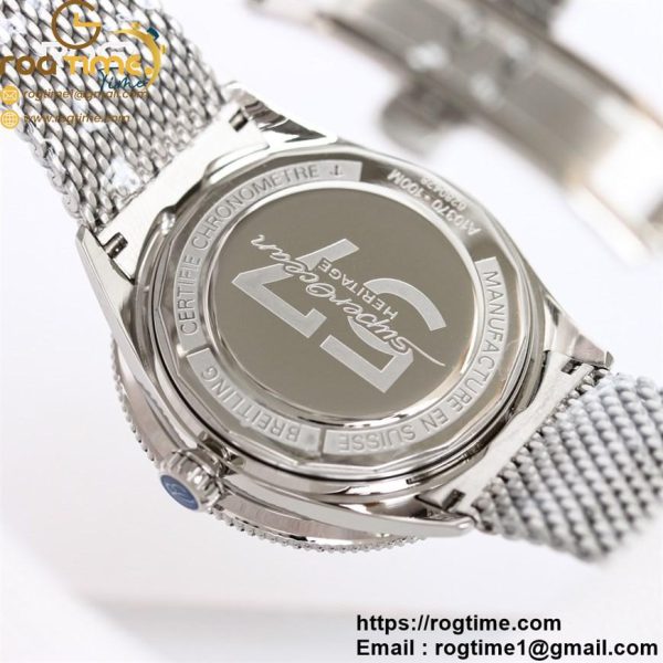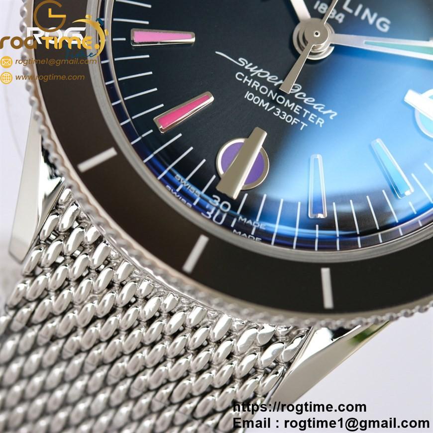 Description SuperOcean Heritage 42mm SS GF 1:1 Best Edition Black Ceramic Bezel Black Dial Rainbow Markers on SS Mesh Bracelet A2824